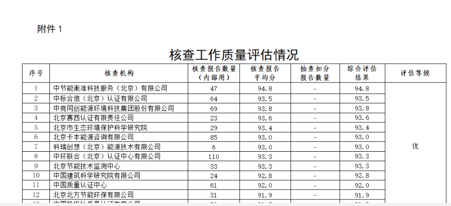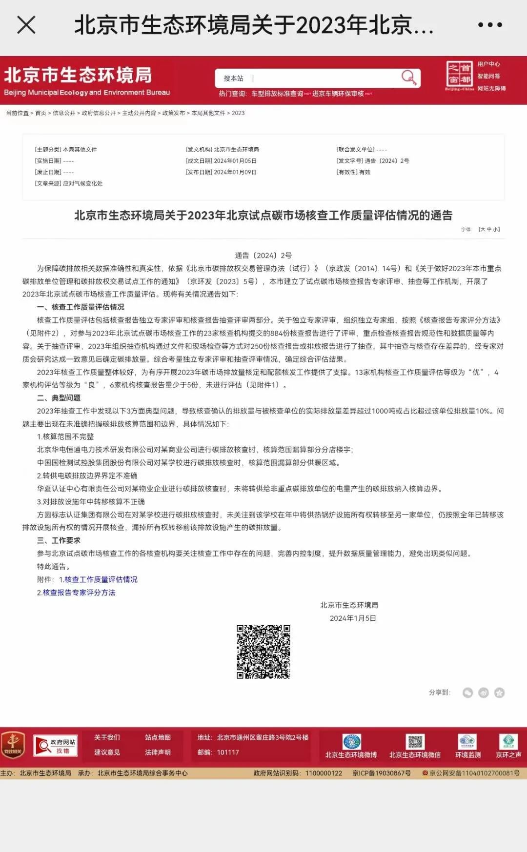 1月9日,,,,,,研究中心所属中节能衡准在北京市生态情形局宣布的关于2023年北京试点碳市场核查事情质量评估中获得综合评分第一名,,,,,,这一效果彰显了中节能衡准在双碳领域的卓越实力和突出孝顺。。。。。。