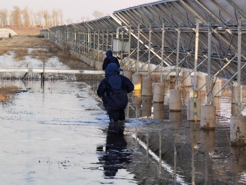 项目并网以后往往得花更多的时间去维护发电设施,,,,,这就要求运维职员将已经损坏的装备替换下来,,,,,以包管整个系统的正常运行。。。。。。自8月份以来,,,,,突如其来的三场台风给装备清静稳固运行带来严肃磨练。。。。。。进入电站的必经之路已被洪流淹没,,,,,基础看不到路在那里,,,,,所见之处,,,,,都是积水,,,,,多处蹊径已酿成深水区,,,,,运维职员没有退缩,,,,,“没有路也要创立路,,,,,就算蹚也得把装备送进去”。。。。。。于是,,,,,运维职员便经由深水区运送装备,,,,,湿透半截的裤管是不惧台风影响最好的证实。。。。。。地面积水严重,,,,,而光伏组件高度大多凌驾3米,,,,,被水浸泡过的地面无法牢靠绝缘梯,,,,,这给运维职员维护发电装备制造了严重障碍,,,,,磨练装备难度大大增添,,,,,但这依然阻挡不了运维职员举行装备运维的刻意。。。。。。面临地面无法牢靠梯子的逆境,,,,,运维职员纷纷化身“智多星”,,,,,群策群力,,,,,出谋划策,,,,,最后决议在绝缘梯顶端加装挂钩,,,,,再用顶端的挂钩悬挂在光伏支架上举行维护,,,,,解决运维难题。。。。。。 气温骤降,,,,,寒风飒飒;;;;;;不惧严寒,,,,,站好每一班岗。。。。。。 由于太阳能华北区吉林片区地理位置特殊,,,,,终年伴有天气转凉的迹象,,,,,在严寒的天气下事情已经是运维职员的事情常态,,,,,可是在零下30-40度的严冷气温下举行装备巡检事情,,,,,照旧给运维职员带来了极大的挑战。。。。。。在巡检现场,,,,,经?????梢钥吹椒鲈谧氨干厦娴氖侄车猛ê,,,,,已经变得僵硬。。。。。。严重的时间甚至很难举行正常的维护事情,,,,,回暖也需要好一阵子。。。。。?????墒鞘奔渚褪欠⒌缌,,,,,装备提前一分钟维护好,,,,,我们就多发一度电。。。。。。光伏厂区严禁烟火,,,,,于是运维职员只能用体温取暖和的方法,,,,,将自己的手揣在衣服里贴着皮肤来举行缓解,,,,,只有这样才华既包管清静,,,,,又能将装备磨练故障尽快完成。。。。。。 并网在即,,,,,关卡重重;;;;;;全心起劲,,,,,施展最大的价值。。。。。。