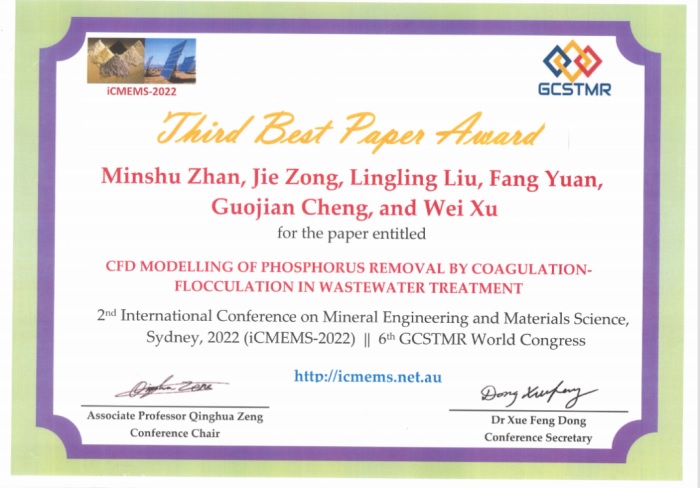 克日,,,,基于公司牵头肩负的集团公司2019年度重大科技立异项目《污水处置惩罚新型药剂开发及投加量优化控制研究与树模》的“除磷药剂智能投加系统”手艺效果完成的《CFD Modelling of Phosphorus Removal by Coagulation-Flocculation in Wastewater Treatment 》论文在第2届矿物工程与质料科学国际聚会(The 2nd International Conference on Mineral Engineering and Materials Science, 简称iCMEMS-2022)上获评优异论文(三等奖)。。。。。。